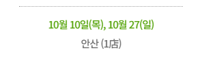 - 운영 안내: 안산 매장은 10월 10일과 27일에 휴무하며, 두 날짜 모두 주말 및 평일에 걸쳐 있으므로 고객 여러분의 사전 확인이 필요합니다.