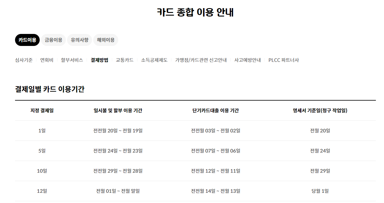 | 결제일 | 일시불 및 할부 이용 기간 | 단기카드대출(현금 서비스) 이용 기간 | 장세 납입일(청구서 도착일) |