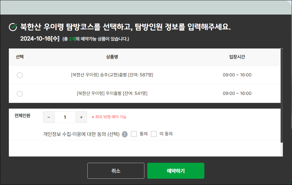 예약 변경이나 취소는 국립공원공단 예약 사이트에서 가능합니다. 다만, 예약 취소는 방문 예정일 며칠 전까지 가능하니 취소 기한을 꼭 확인하세요.